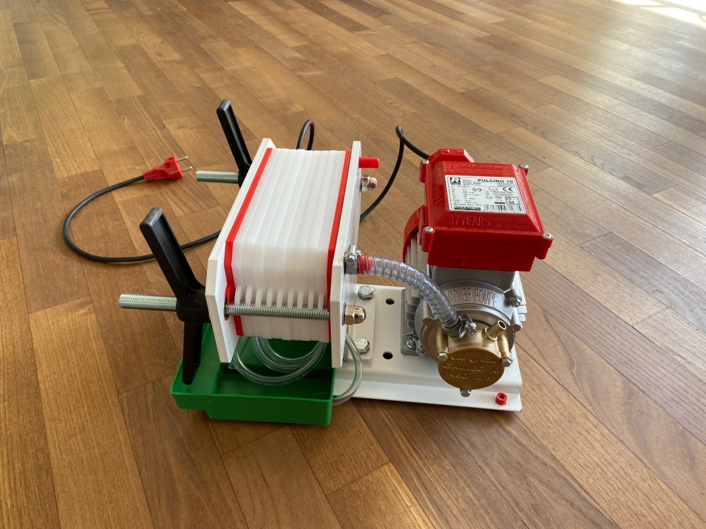 Im Grunde ist der Likör jetzt schon trinkfertig. Er ist allerdings noch trüb und im laufe der Zeit setzen sich die Schwebstoffe auf dem Boden ab. Eigentlich nicht schlimm, aber das Auge trinkt auch mit. Aus diesem Grund wird der Likör jetzt noch gefiltert. Dazu habe ich mir eine Rover Pulcino 10 Filterpumpe angeschafft. Der Filtervorgang läuft dann folgendermaßen ab: