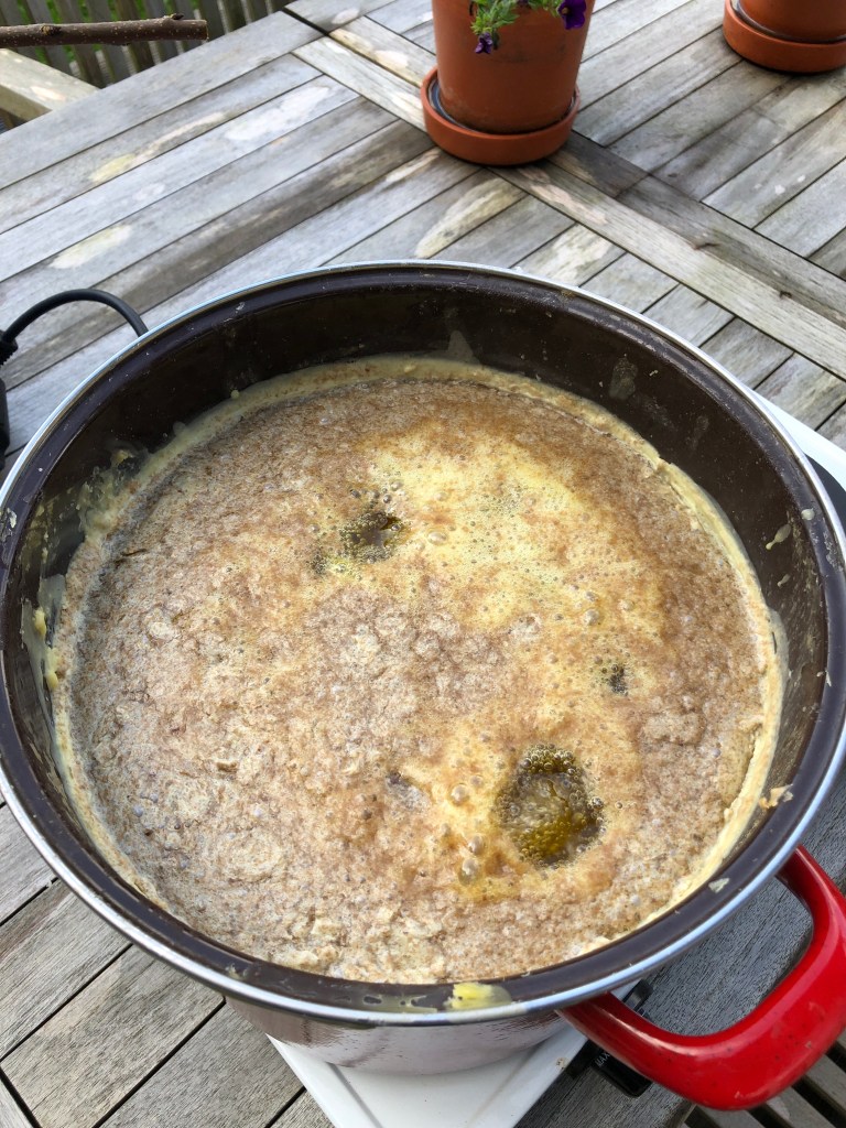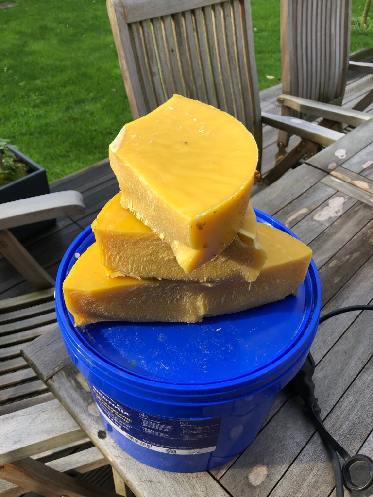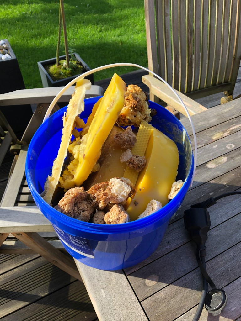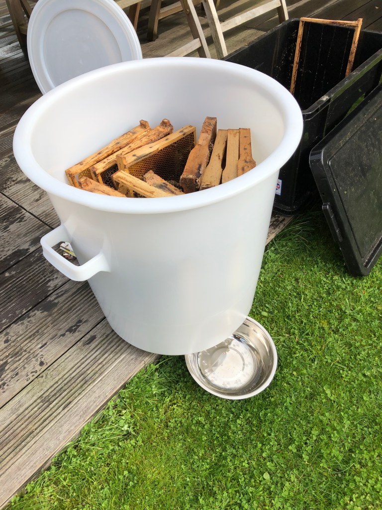 Winter is coming. Die Arbeiten an den Bienen sind für dieses Jahr weitgehend abgeschlossen und die Bienen für die Einwinterung vorbereitet. Die Völker sind, soweit notwendig, aufgefüttert und die Sommerbehandlung gegen die Varroamilbe ist durchgeführt. Bis auf die Winterbehandlung im Dezember ist ausser gelegentlichen Kontrollen nichts mehr an den Bienen zu tun. Der Imker kann sich anderen Arbeiten widmen. Ich habe begonnen das im laufe des Jahres gewonnene Wachs zu bearbeiten und noch nicht ausgeschmolzene alte Waben zu schmelzen. Vor einiger Zeit habe ich beschrieben, wie man mit Hilfe von Sonnenenergie alte Waben ausschmelzen kann. Das funktioniert jetzt leider nicht mehr. Wenn die Sonne denn mal scheint, steht sie zu tief und der Sonnenwachsschmelzer wird nicht mehr heiß genug. Jetzt kommt der Dampfwachsschmelzer zum Einsatz. Wasser wird in einem abgeschlossenem Behälter zum Kochen gebracht und der heiße Wasserdampf wird in ein Behälter mit den Waben geleitet. In dem Behälter wird es so heiß, dass das Wachs schmilzt und durch eine Öffnung im Boden des Behälters in ein Gefäss fließt. Der Vorteil an dem Dampfwachsschmelze ist, dass ich bis zu dreizehn Waben in einem Rutsch ausschmelzen kann.