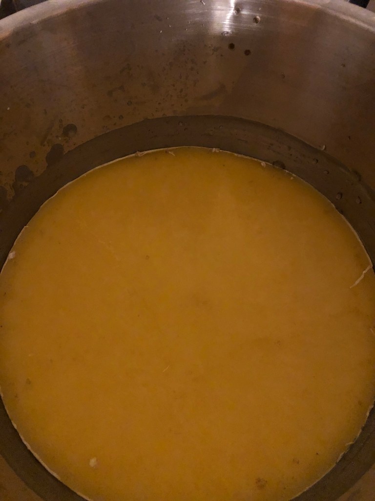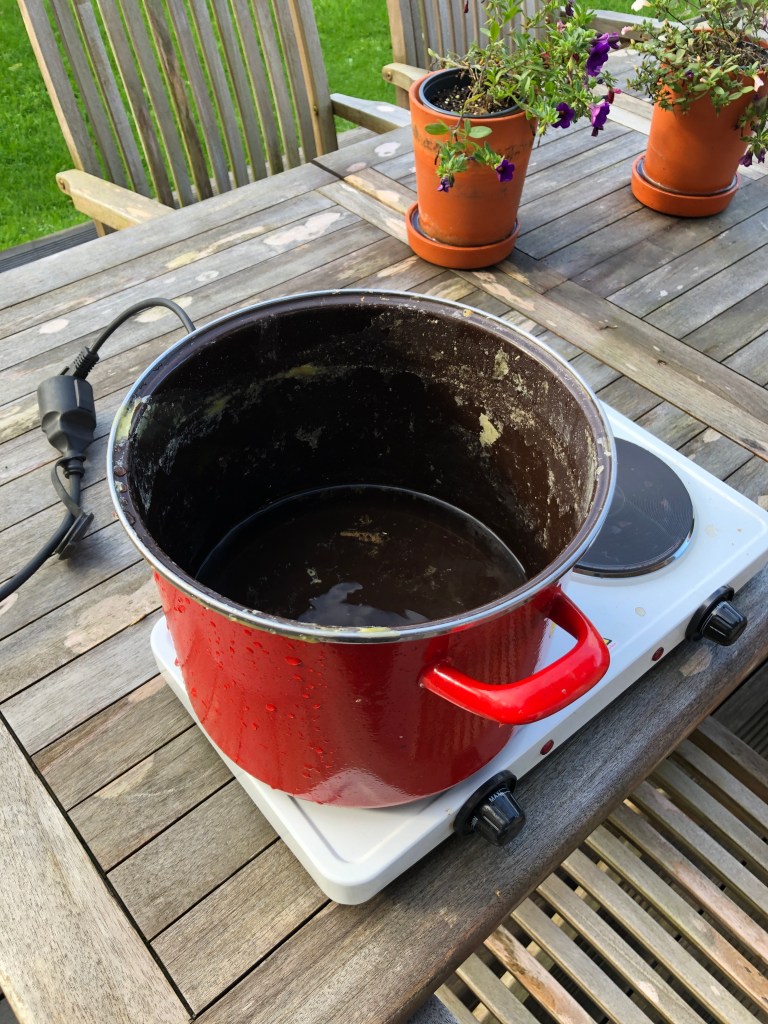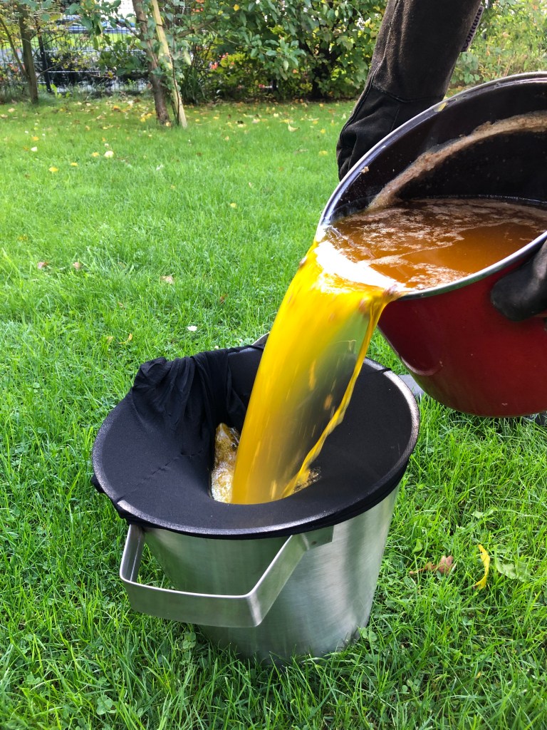 Das ausgeschmolzene Wachs muß anschliessend gereinigt werden. Diesen Vorgang nennt man klären. Das gesamte aus den Waben ausgeschmolzene und wieder fest gewordene Wachs wird in einem Wasserbad erneut geschmolzen. Das Wasser muss kalkfrei sein, sonst bekommt das Wachs eine gräuliche Farbe. Ich nehme dazu aufgefangenes Regenwasser aus der Regentonne. In einem ausrangierten Kochtopf wird das Wachs mit dem Wasser geschmolzen und dann gesiebt. Für das Sieben nehme ich ausrangierte Nylonstrümpfe. Da kann das Wachs durchfließen und der grobe Dreck bleibt im Strumpf.