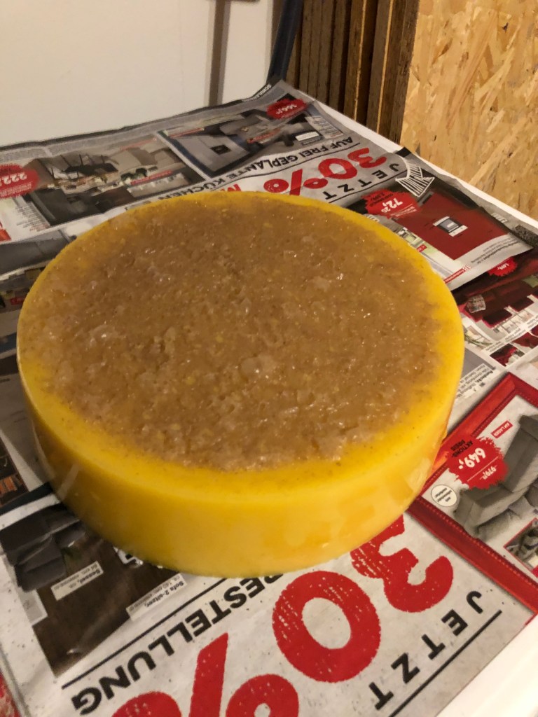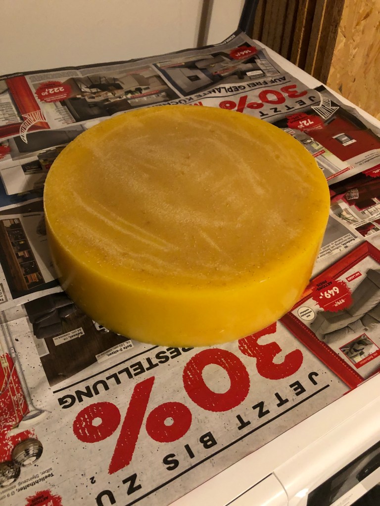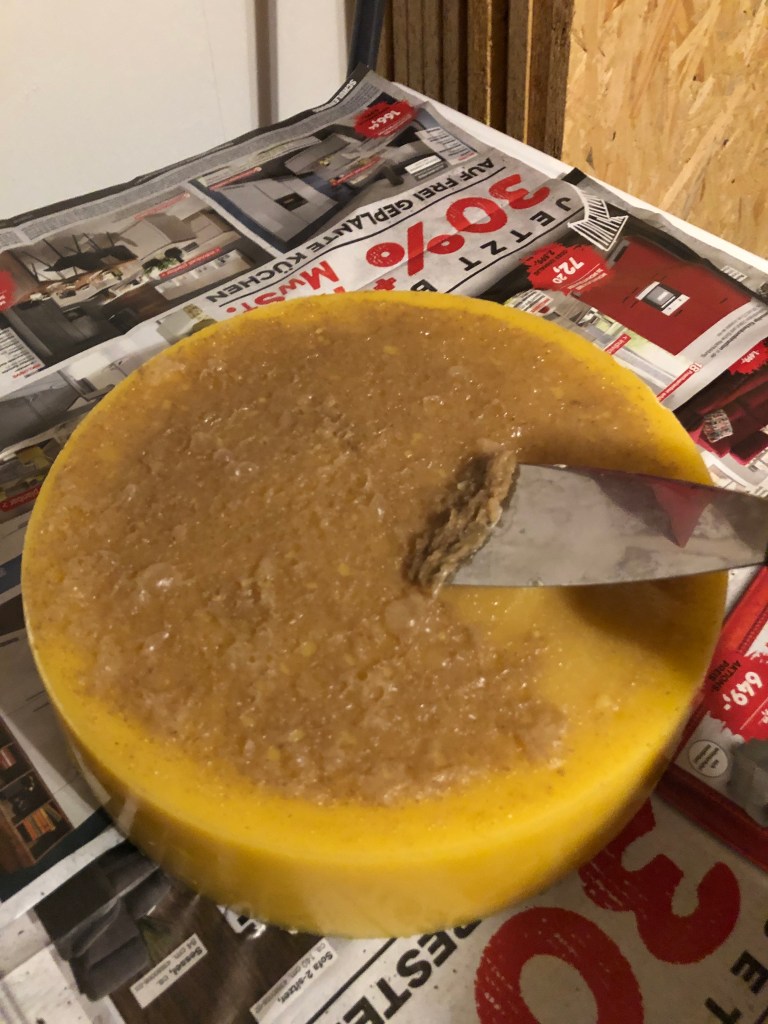 Das flüssige Wachs muß jetzt langsam abkühlen. Während des Abkühlens sinken feinere Verunreinigungen nach unten. Nach ca. 24 Stunden ist das Wachs fest geworden und kann aus dem Gefäß entnommen werden. Die Verunreinigungen befinden sich jetzt am Boden des Wachsblockes und kann mit einem Spatel entfernt werden. Diesen Vorgang wiederholt man zwei- bis dreimal. Dann hat das Wachs einen Reinheitsgrad, dass man neue Mittelwände herstellen kann. Für die Kerzenherstellung sollte man den Vorgang häufiger durchführen.