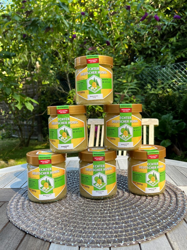 Der Sommerhonig aus dem Jahre 2025 ist abgefüllt und steht zum Verkauf. Das 500g Glas für 7 €.